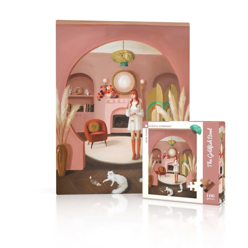 A pair of mischievous cats awaits their next meal from the goldfish bowl.Whimsical Painting by Artist Janet Hill100 Piece Jigsaw PuzzleFinished Puzzle Size: 7"x9"Linen Style Finish to reduce glareMade in USARecommended Age: 10+ Years