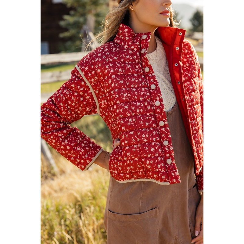 We can't get enough of this quilted coat. It features bright red material, florals, and a high neck. The Helen will add the cutest pop of color to any outfit this Winter!covered functional snapsslightly croppedfully linedside pockets// paired with the free