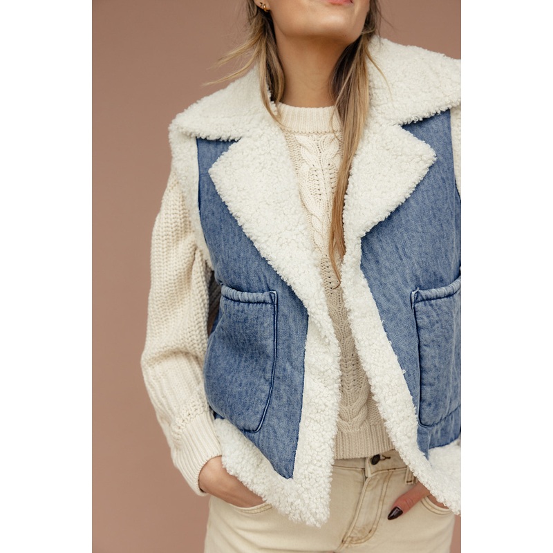 This sherpa-lined jacket features patch pockets and an oversized fit. Wear the Six Sherpa Jacket with anything already in your closet and add a touch of cool girl vibes to your already cool wardrobe.// paired with the free people risk taker mid rise straight jeans in cornsilk + the free people frankie cable sweater