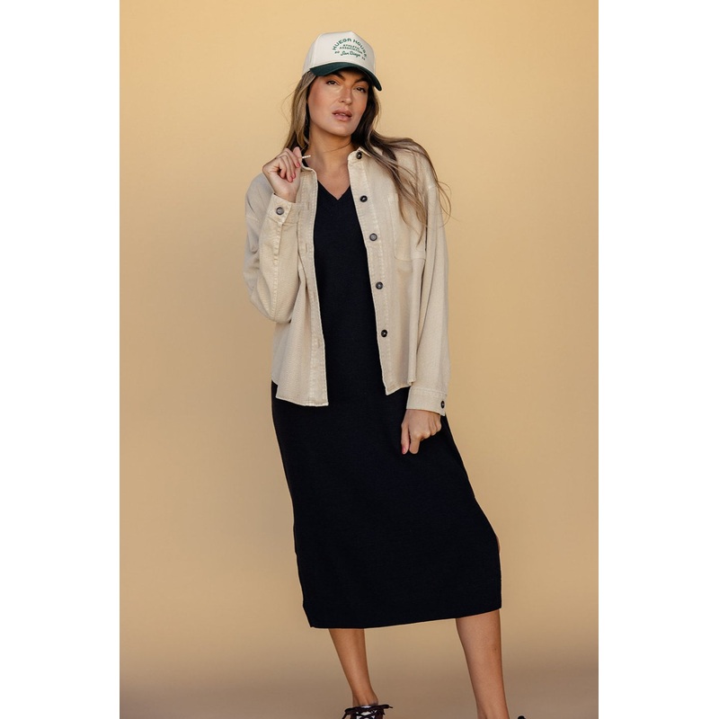 This lightweight Shacket features a high-low hem, classic collar, and functional buttons. It's so easy to throw on over dresses and sweaters and can be worn from season to season.front patch pocketsfunctional buttons// paired with the distant star maxi dre