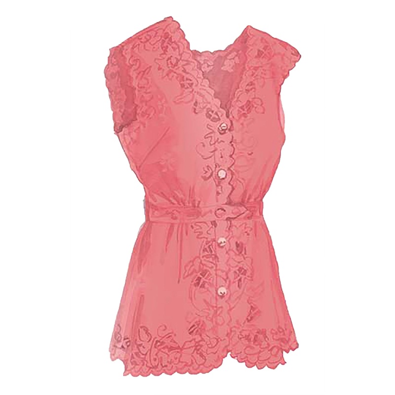 Timeless Cutaway Blouse (No. 3218). Original from France. Rendered in sheer lightweight cotton voile with a little stretchy stuff. Shaped silhouette of cutwork flower embroidery around hem and neckline. Revealing just the right amount of interest front and back. Five-button front placket with hand sewn French knots in the flower centers. Gentle scallops on V-neck and curved hem.