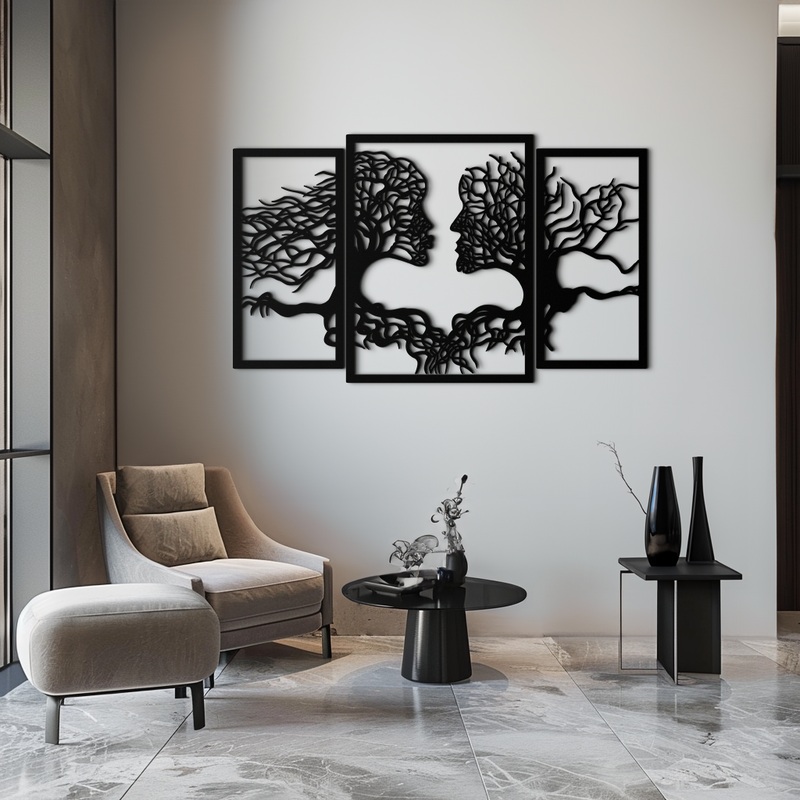 Embrace the beauty of nature and romance with the Tree of Life Lovers Metal Wall Art. This breathtaking three-piece metal artwork features two intertwined trees forming the silhouettes of lovers, symbolizing unity and deep connection. Crafted from 1.5mm premium steel and coated with a durable electrostatic paint, this piece is built to resist rust and fading.