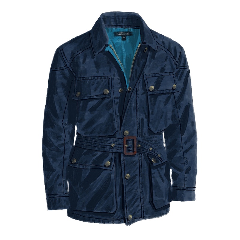 Tropical Weight Isle of Man Jacket (No. 6995). In premiumItalian cotton/nylon two-tone gabardine, uniquely suited for spring trials. Two layer fabric repels water and wind. High collar with adjustable throat latch. Two chest pockets (one tilted for easy access for dispatch on a motorcycle). One back map pocket. Two waist pockets. Reinforced shoulder and elbow patches.Interior pocket. Authentic ring pull at front zipper. Snap storm flap. Fabric has been overdyed so the shell is dark navy, but the bottom layer takes on an intense tropical blue. Antique brass snaps. Leather belt buckle. Brass underarm grommets for ventilation, Antique brass trimmings. Imported.