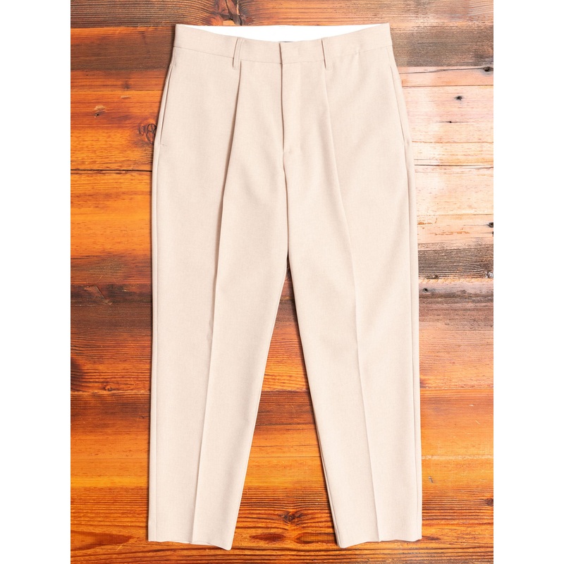 • TheTropical Suiting Pants are acenter-crease style pant from ATTACHMENT. Constructed from ahard twisted polyester yarn, the fabric has a fine, subtly textured qualityreminiscentof fine linen. The pants are cut with a relaxed top block and aslight taper through the leg, and come equipped with a classic button and clasp style suit pant closure.