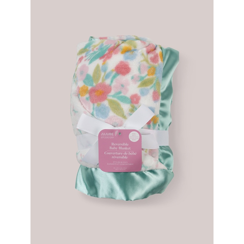 With ultra-soft, thick fabric and a silky satin trim, the double-layered Reversible Baby Blanket from JuJuBe Studio Oh! is a plush addition to any nursery. Each side displays a soothing, pastel color palette with adorable coordinating patterns, such as sweet cherries and dots and cowboy boots and lucky horseshoes. Machine washable with a comfortable, durable construction, these luxurious reversible blankets measure 30 by 40 inches (76.2 cm 101.6 cm) and are ideal for keeping warm around the house or on the go and for tummy time on the floor.