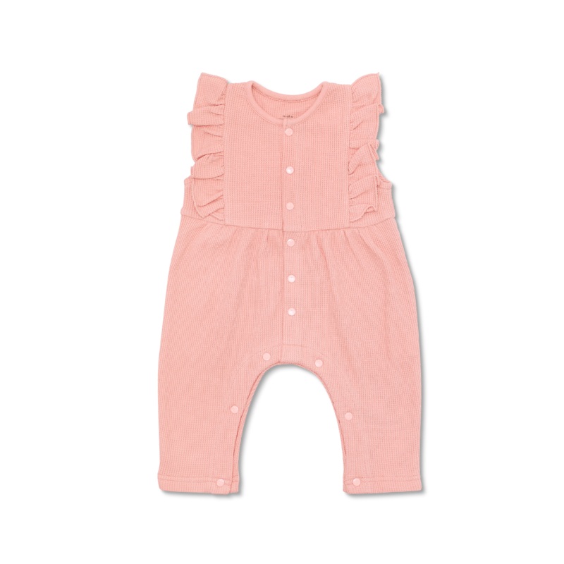 100% organic cotton OEKO-TEX 100 eco-friendly fabric dyes Sleeveless with ruffle detail Easy snap front & leg closure Machine wash, tumble dry low