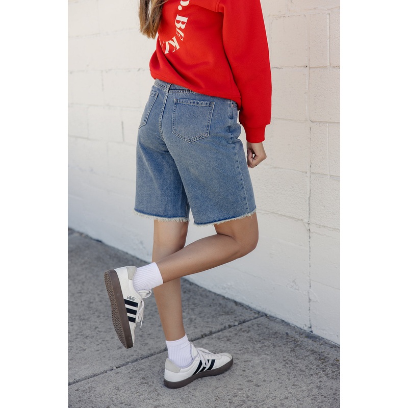 Get set for summer fun with these adorable denim bermuda shorts! With cute frayed edges and handy pockets, they're your go-to for sunny days. Pair them with literally anything and go have some fun! :)mid to high-rise5-pocket designzip-fly + button closure/