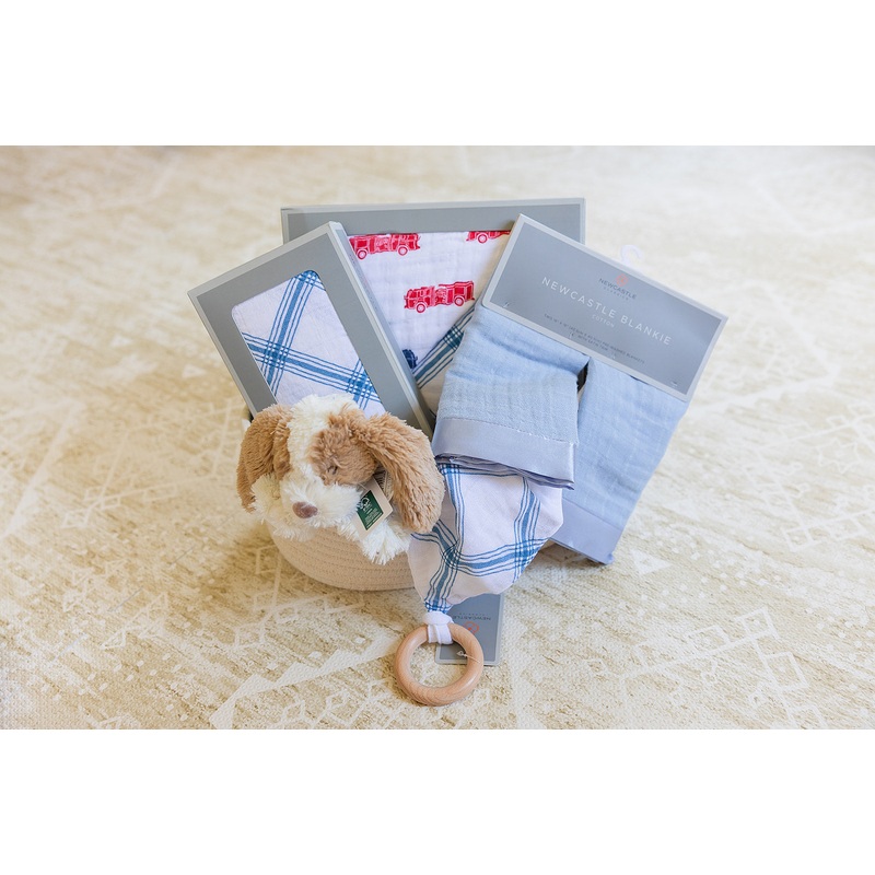 Welcome Baby Boy basket includes a 100% cotton Newcastle Blanket, a cozy swaddle, blankie set and soothing teether. The ensemble is completed with a lovable dog David tuttle plush from Happy Horse, ensuring a touch of whimsy. Each piece is thoughtfully arranged in a durable cotton rope basket, perfect for repurposing. This set is not only a joy to give but also a treasure to receive.