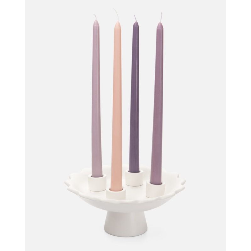 The Scalloped Advent Wreath is a modern take on the traditional Advent wreath. Crafted from ceramic, each piece is handmade, resulting in unique character and subtle variationsincluding slight differences in the spacing between candle holders.Each wreath i