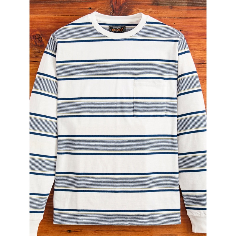 DetailsSizingBrand InfoThis long sleeve pocket tee is made of 40/2 knit cotton jersey, woven with a fine thread count at a high density and decorated with a wide stripe design. The fabric sports a soft touch, sleek texture, and loose drape. The shirt is ad