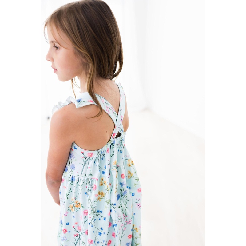 Our Cross Back Dress Dress is perfect for summer! Straps criss cross in the back and are finished off with a sweet ruffle on the shoulder. Also available in a matching baby romper! Perfect for family matching.Super soft fabric stays bright wash after wash.