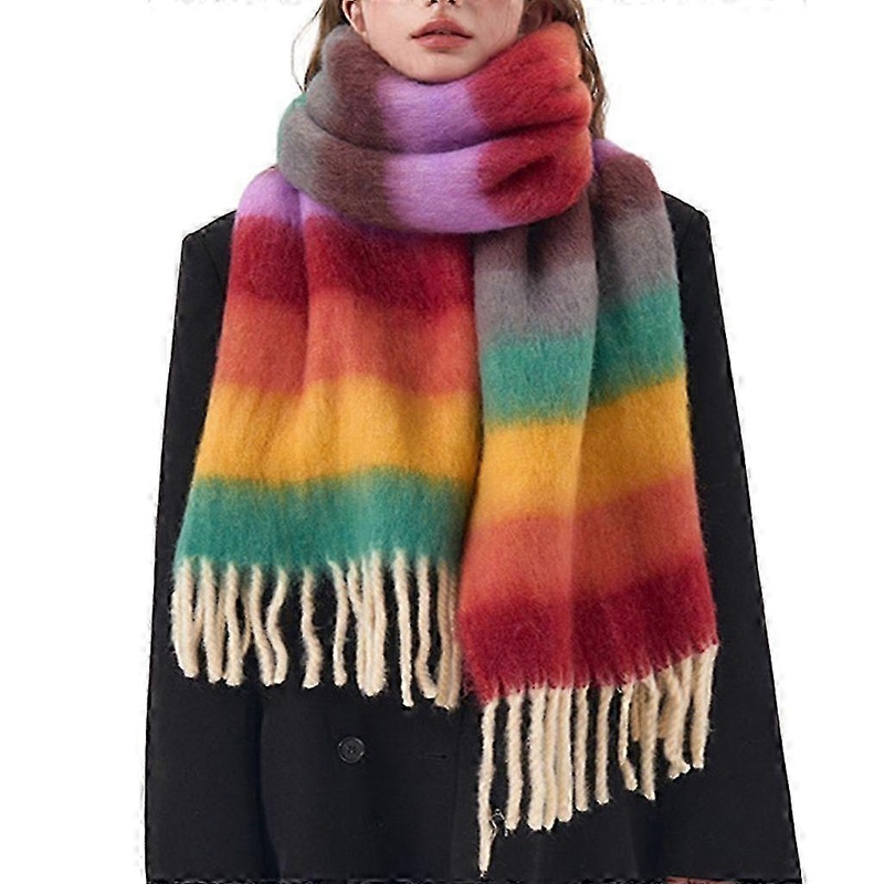 Add a popular of color to your wardrobe with this striped rainbow scarf.
