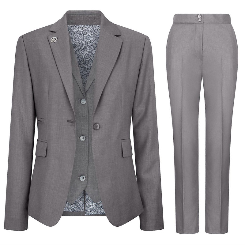 Description Elevate your professional wardrobe with this womens 3-piece tailored suit in a classic plain grey finish. Designed for a sleek and structured silhouette, it includes a matching blazer, waistcoat, and trousers that contour the body without sacri