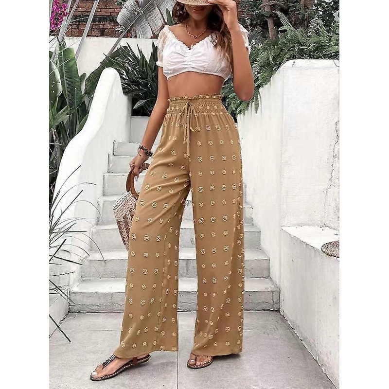 Fabric name: polyester fiber Main fabric component: polyester (polyester fiber) Main fabric component 2: polyester (polyester fiber) Style: wide-leg pants Pants type: loose type Pants length: long pants Waist type: high waist Thickness: medium Popular elements: jacquard Color: khaki, red, green, pink, black Size: S, M, L, XL, XXL Style type: temperament commuting Main fabric component content: 80% (inclusive) -90% (not included) Style: commuting style Elasticity: slightly elastic Main fabric component 2 content: less than 30% Process: jacquard