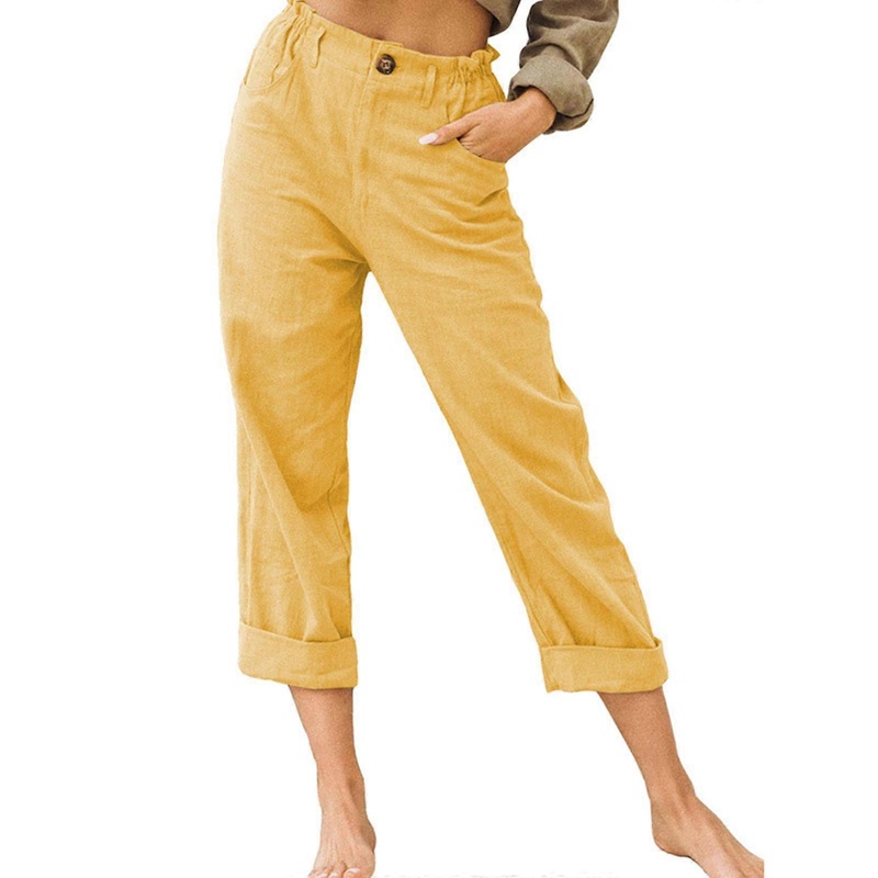 High waisted, front button and back elastic design, features belt loop, loose fit.Straight leg pant, simple plain solid color, nine-point pant, two side pockets.