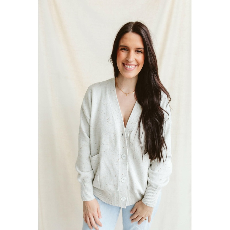 The button up organic knit sweater is designed for an oversized comfy fit, with a deep V-neck and two front pockets. This sweater will be your newest obsession! (Mix and match with your babe!)