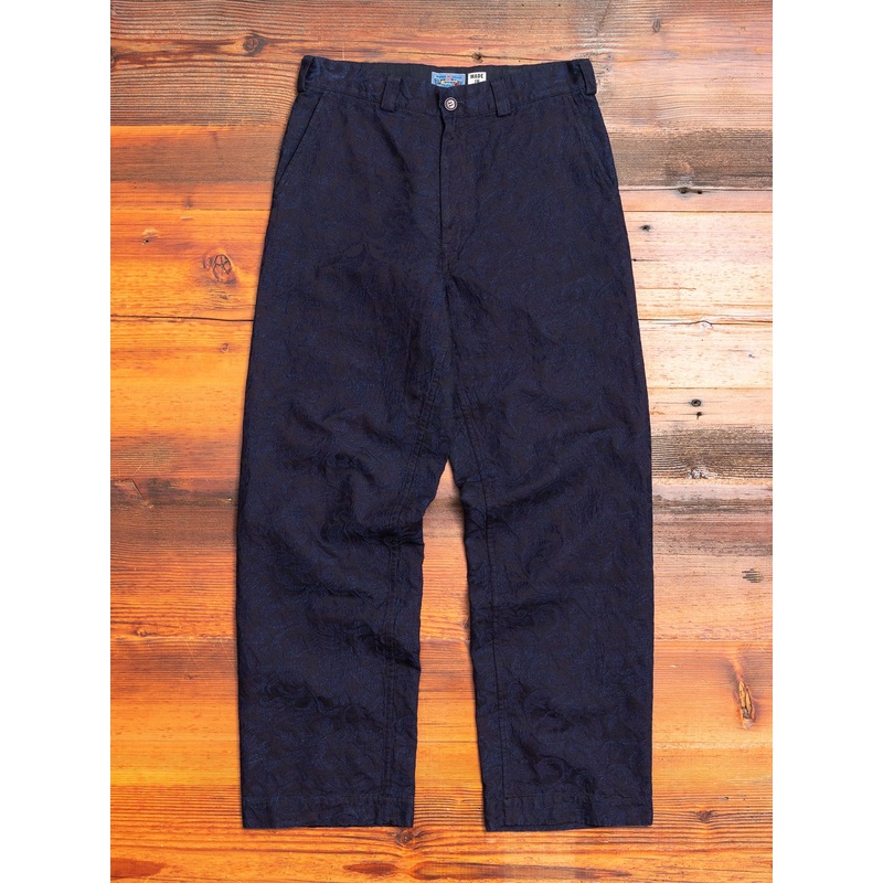 • Thishand crafted pant from Blue Blue Japan is sewn using a custom jacquard fabric woven to resemble flowering plants. The yarn used for the pattern is yarn dyed indigo with a variety of subtle differences in shade. Thetrouser is finishedin a relaxed fit with slant pockets and a zipper fly.